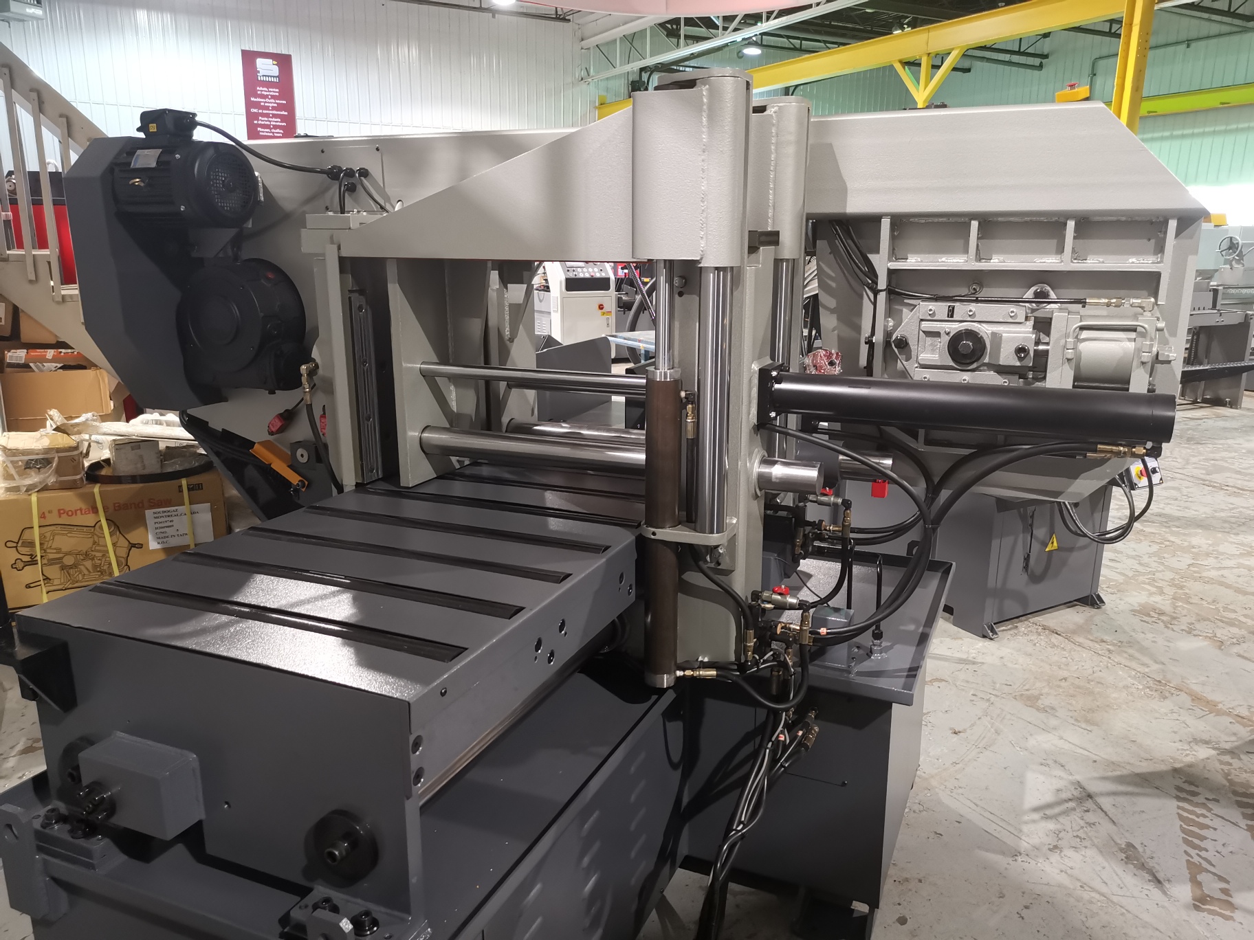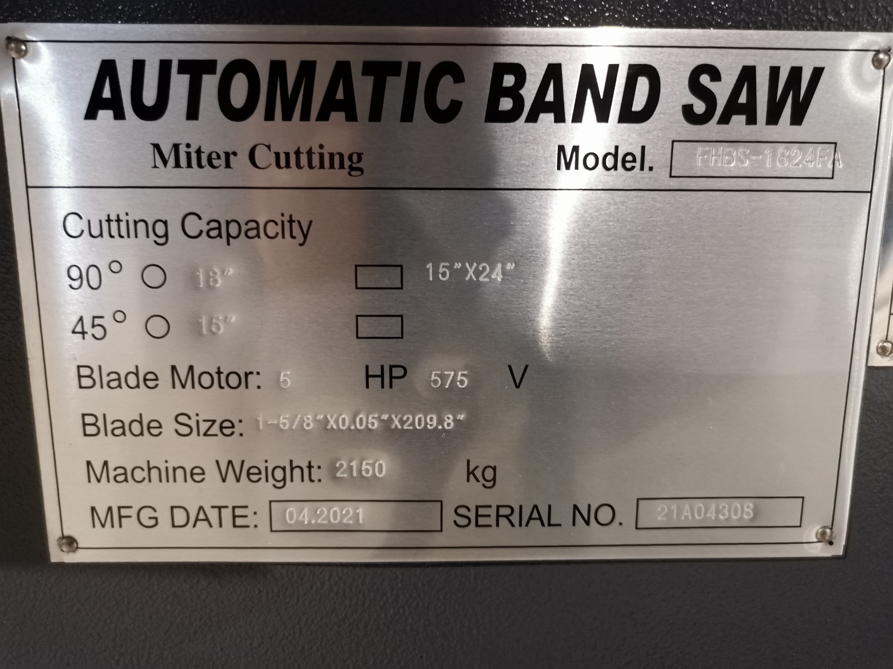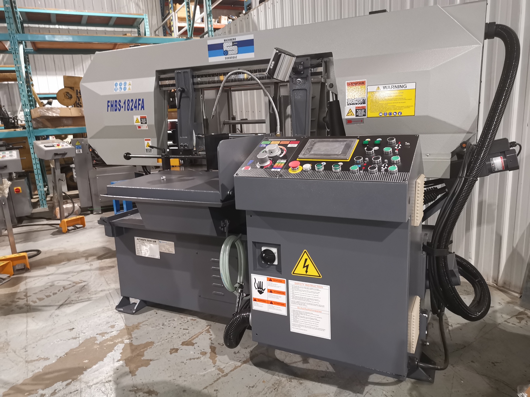 La FHBS-1824FA est une scie à ruban horizontale entièrement automatique, conçue pour la coupe industrielle de métaux. Avec une capacité de coupe généreuse de 18″ x 24″, elle traite aisément les pièces de grande taille. Elle est équipée d’une tête pivotante pour des coupes en onglet jusqu’à 45°, de vitesse de lame variable de 30 à 85 m/min, et d’un moteur puissant de 5 hp fonctionnant en 575V / 3 phases. Ses fonctionnalités telles que la tension hydraulique de la lame, le convoyeur automatique de copeaux, et les étaux hydrauliques à course complète améliorent l’efficacité et la précision. Le panneau de contrôle convivial permet de mémoriser jusqu’à 10 préréglages de coupe, facilitant les tâches répétitives.